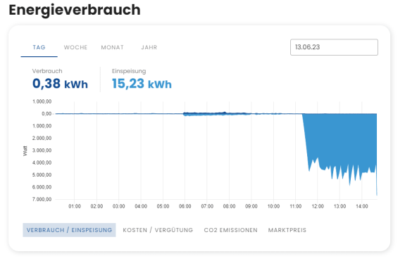 Je nach Interesse können die Parameter Verbrauch/Erzeugung, Kosten/Vergütung bzw. CO2-Emissionen auf Tages-, Wochen-, Monats- oder Jahresbasis ausgewertet werden. Bei intelligenten Messsystemen Strom werden 15-Minuten-Werte zur Verfügung gestellt.